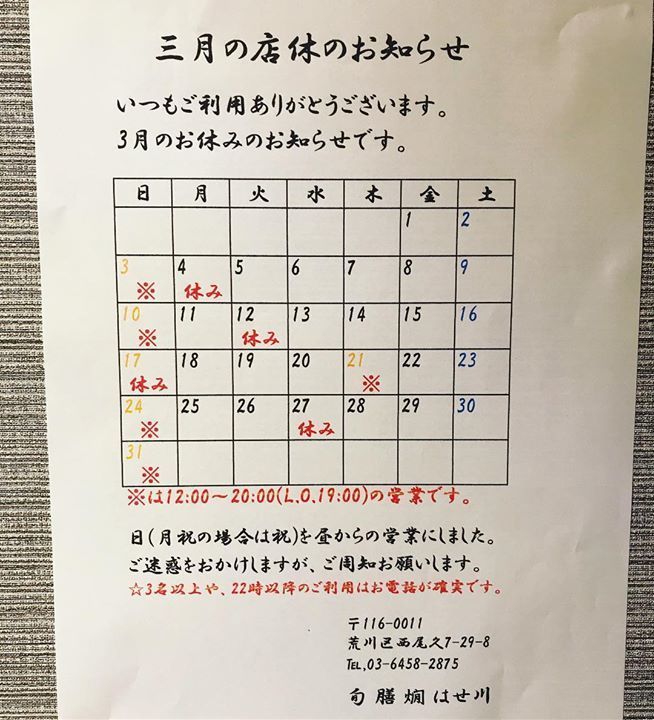 3月の店休のお知らせです!よろしくお願い致します🤲