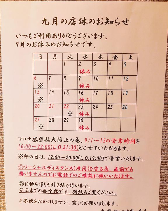 9月の店休日のお知らせです。今月からまた※印(日曜日や連休最終日)は12時〜20時までの営業です。よろしくお願い致します🙇♂️
