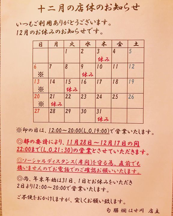 12月の店休日のお知らせです。時短です。よろしくお願い致します🙇♂️